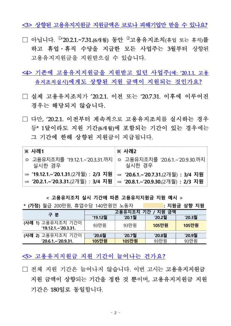 2020년 3월 1일부터 이 고용유지지원금 제도가 달라졌다. 코로나 19 사태로 고용유지지원금 지원금액을 일시적(6개월)으로 상향하는 내용이다. 즉, 2020년 2월 1일~7월 31일 동안 휴업 또는 휴직의 고용유지조치를 하고, 휴업, 휴직 수당을 지급한 모든 사업주에 대한 지원 비율을 상향한다는 내용이다. 최근 이 고용유지지원금 신청이 기하급수적으로 늘어났고, 노동자의 고용안정을 위해 사업주의 부담을 완화해달라는 의견이 많아, 지원금액을 오는 7월 31일까지 지원금액을 상향한다는 것이다. 그럼 3월 1일부터 7월 31일까지 한시적으로 달라진 고용유지지원금 신청방법을 정리해보자.