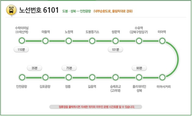 먼저 공항버스 6101 노선부터 확인하셔야 내가 이용할수 있는 공항버스인지 알수 있는데 보시는바와 같이 수락산역에 위치한 수락터미널을 출발하여 7호선과 4호선 지하철역 위주로 정차한 후 김포공항을 거쳐 인천공항갑니다.