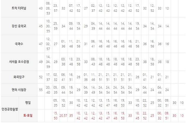 상단은 광명 지역이 아닌 곳의 시간표인데 경유하는 코스를 참고하시고 반대로 인천공항에서 광명까지 버스를 이용하는 분들이 맨 아래쪽에 있는 인천공항 출발 시간표를 참고하시는게 좋을것 같아 함께 올렸습니다.
