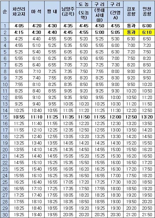 구리에서 출발하는게 아니라 남양주 차산리가 차고지이기 때문에 마석, 평내를 거쳐 구리에서 인천공항까지 운행하는데 시간표는 어떻게 되고 요금은 얼마인지 자세히 알아보겠습니다.