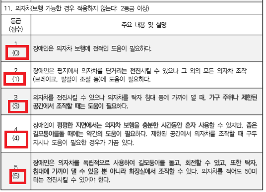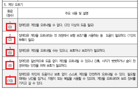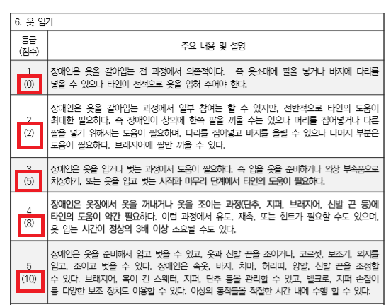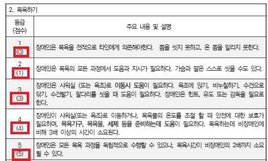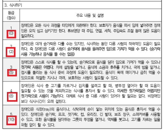 예를들면 개인위생같은경우 한단계마다 1점씩 감점이 되고, 식사나 용변처리는 한단계에 2점씩 감점이 된다는걸 위의 표를 보면 아실수 있죠.