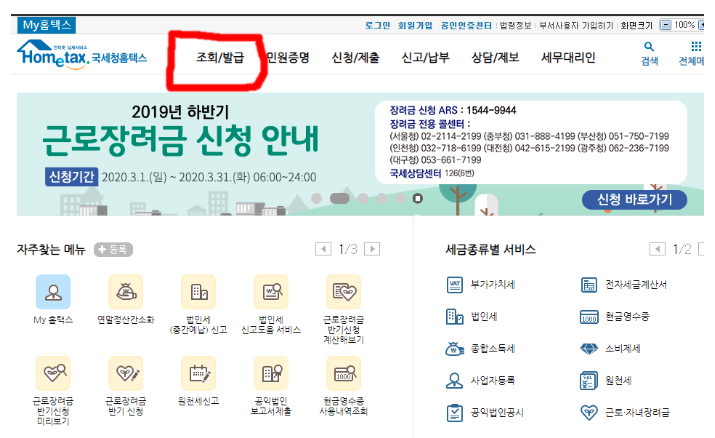 다음 화면을 보시면 조회/발급,민원증명,신청/제출,신고/납부등 다양한 메뉴가 보이실텐데 빨간네모로 표시된 조회/발급 메뉴를 클릭하여 들어가도록하자.