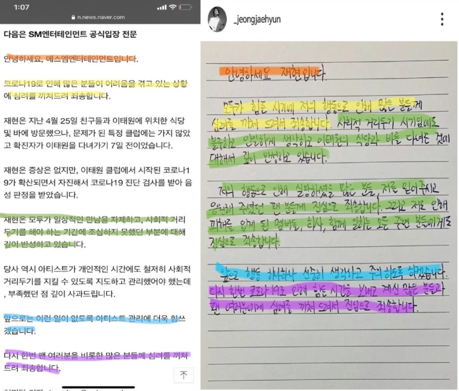 태원 아이돌 팬덤 반응+nct 재현 아스트로 차은우 자필 사과문 논란