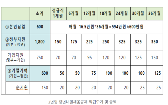 중소, 중견기업에 취업한 청년들이 자산을 마련할 수 있도록 도와주는 정책인데 청년이2년 또는 3년간 근무를 하며 매달 적립금을 모으면 기업과 정부에서 돈을 합쳐 총 1,600만원 또는 3,000만원의 목돈으로 만들어주는 엄청난 혜택을 가진 정책이다.