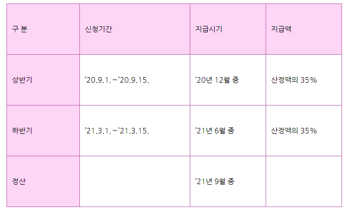 반기별 지급 및 정산: 장려금 산정액의 35%를 반기별로 지급받고, 소득귀속연도 다음 연도(2021. 5월)에 정기 신청했을 경우의 지급액과 비교하여 정산한다.