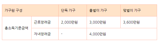 근로 자녀장려금신청자격 총소득 요건은 2019년도 연간 부부합산 총소득이 가구원 구성에 따라 정한 총소득기준금액 미만이어야 한다.